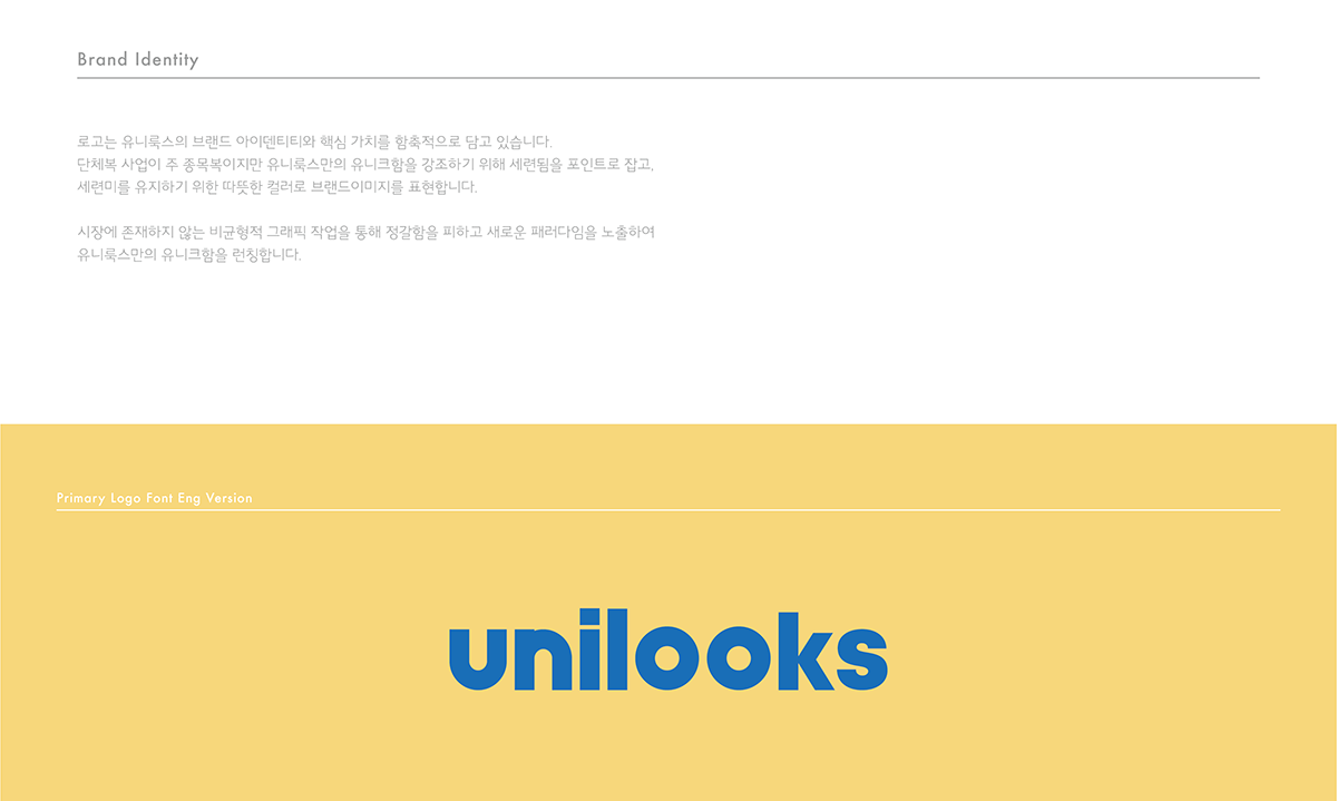 삼아 브랜딩에 담아내기 위한 방법을 모색하였습니다. Unilooks의 단어 중 겹치는 스펠링 ’oo’를 꼬집어,